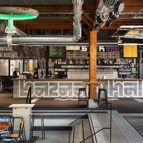 Un soin tout particulier a été apporté aux éclairages, entièrement conçus sur mesure. Grands anneaux métalliques lumineux, anciennes quilles de bowling réutilisées et transformées en luminaires, chaque élément participe à créer l’atmosphère unique du lieu. L’éclairage devient ici un véritable outil de mise en scène des volumes et des usages.
