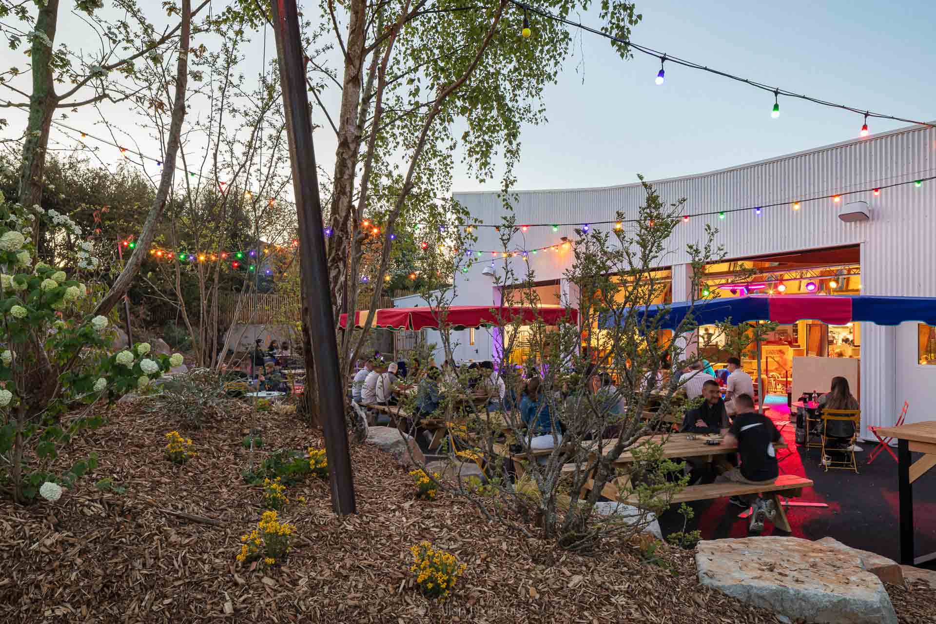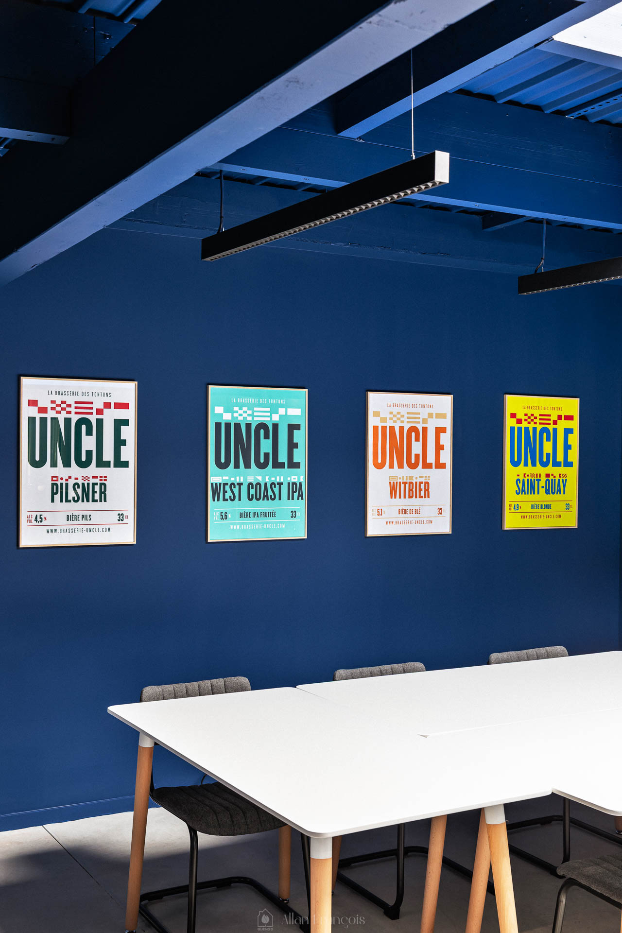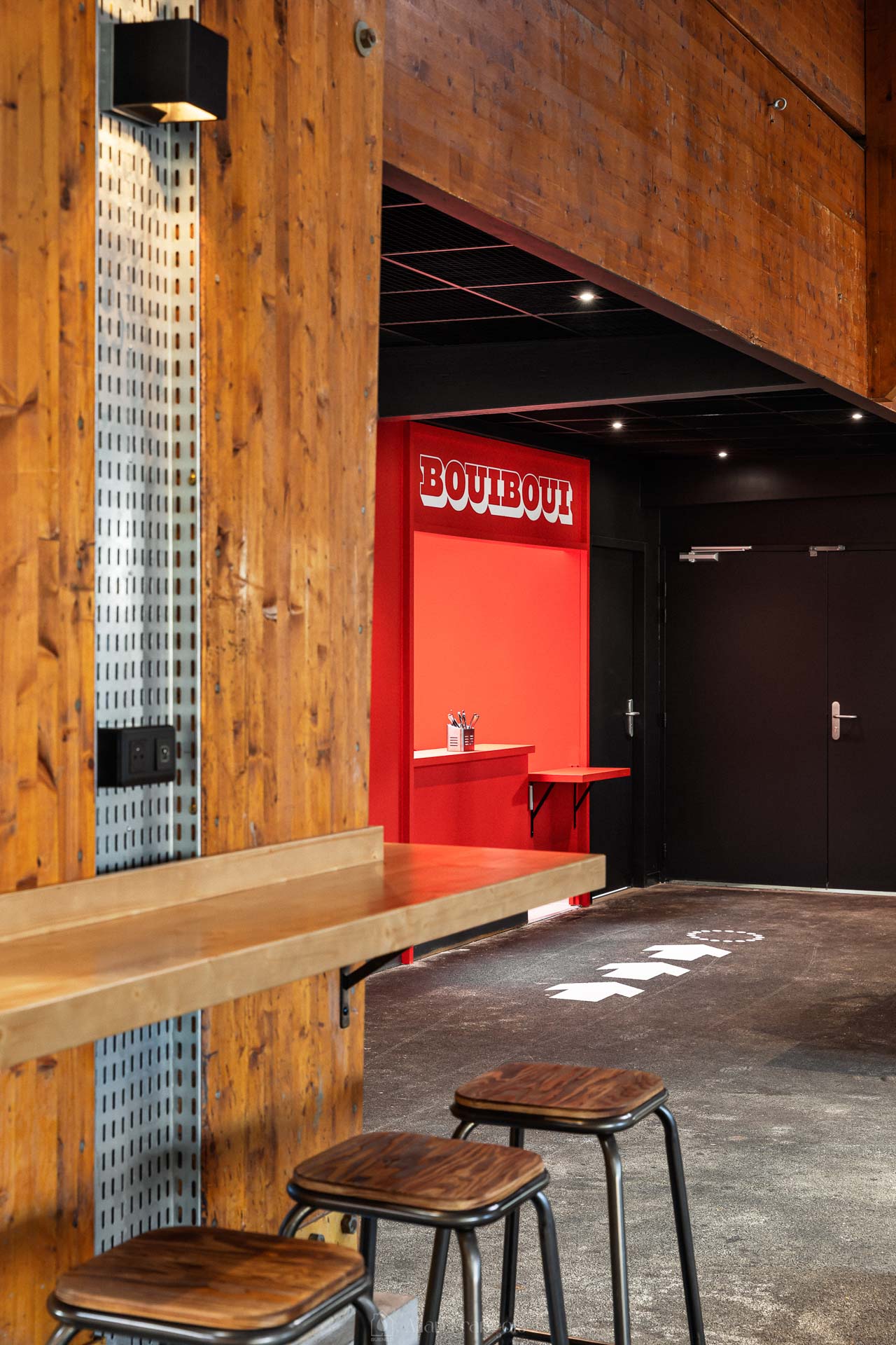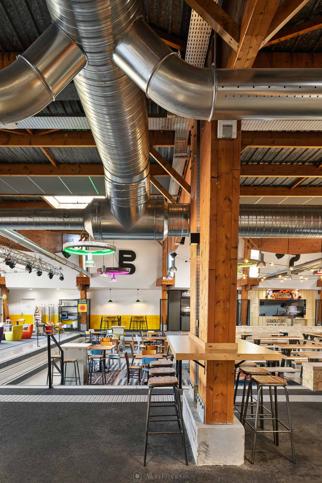Un soin tout particulier a été apporté aux éclairages, entièrement conçus sur mesure. Grands anneaux métalliques lumineux, anciennes quilles de bowling réutilisées et transformées en luminaires, chaque élément participe à créer l’atmosphère unique du lieu. L’éclairage devient ici un véritable outil de mise en scène des volumes et des usages.
