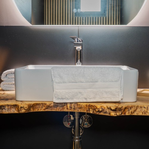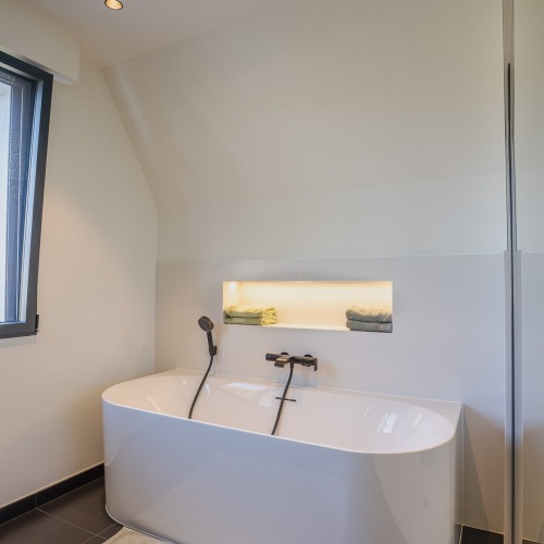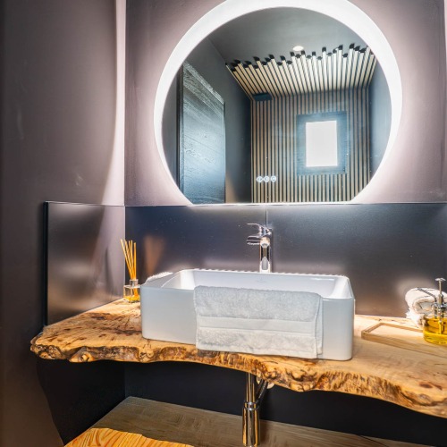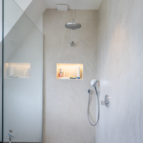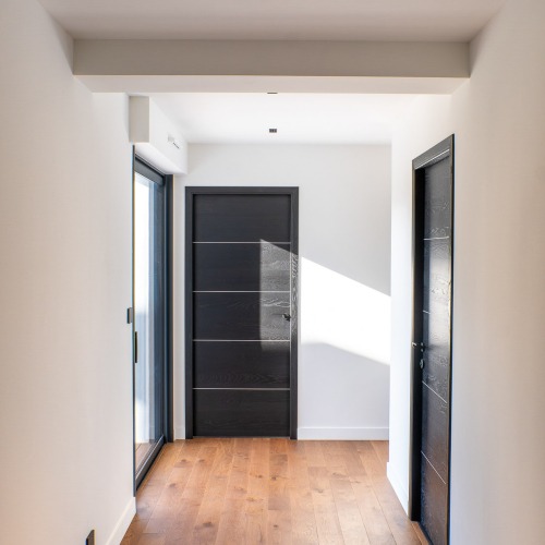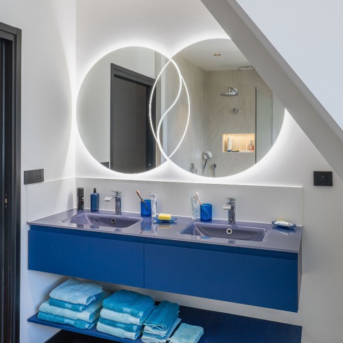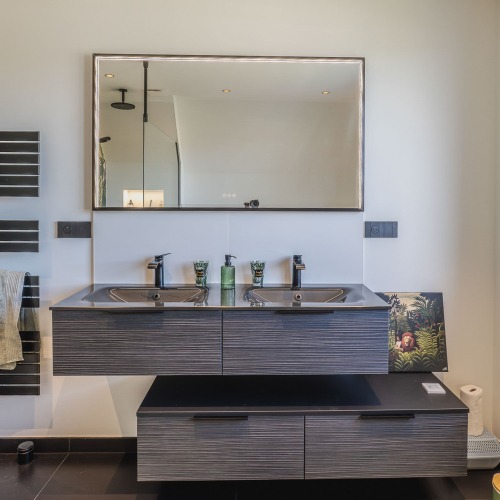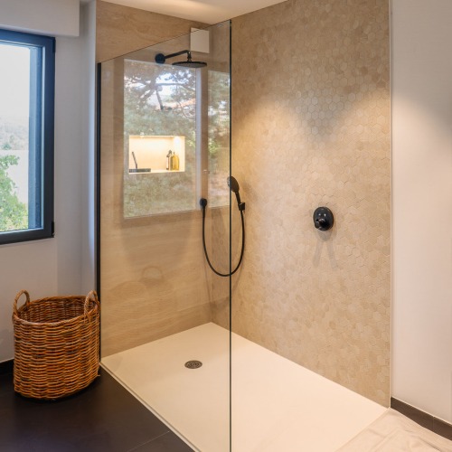 Nous sommes intervenus sur l’ensemble des lots plomberie, chauffage, ventilation et électricité, dans une logique globale et cohérente avec l’architecture du projet. Les salles de bains ont fait l’objet d’un travail particulièrement soigné, avec la pose d’équipements intégrés dans des agencements sur mesure : meubles vasques, miroirs rétroéclairés, douches avec mitigeurs encastrés et niches éclairées, baignoire îlot avec robinetterie murale, ainsi que des receveurs extra-plats et parois adaptées à chaque espace.