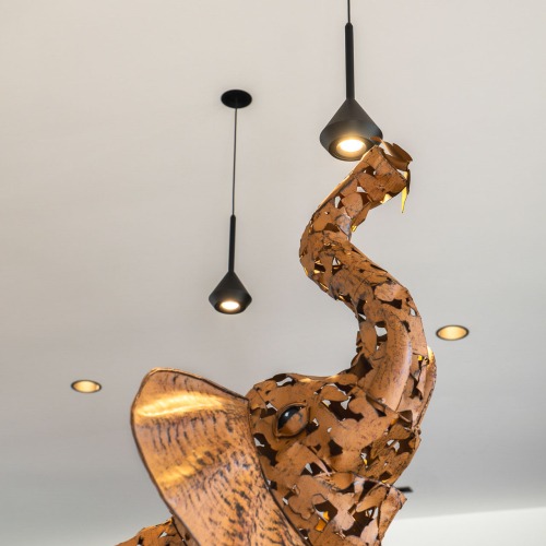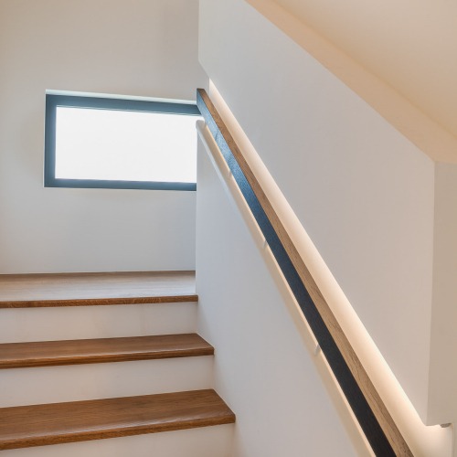 L’éclairage occupe une place centrale dans cette réalisation. Nous avons installé et raccordé différents types de luminaires afin de créer des ambiances variées et maîtrisées : rétro-éclairages intégrés dans les agencements, suspensions sculpturales, éclairages linéaires au-dessus des espaces de vie et LED intégrées dans l’escalier. Chaque point lumineux a été pensé pour s’intégrer parfaitement aux volumes et renforcer l’identité contemporaine de la maison.