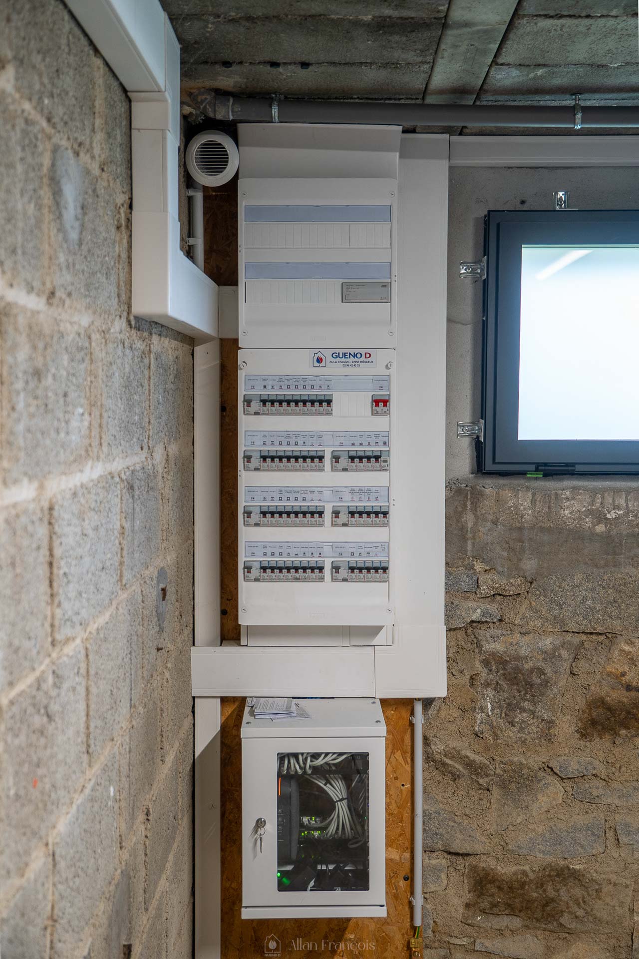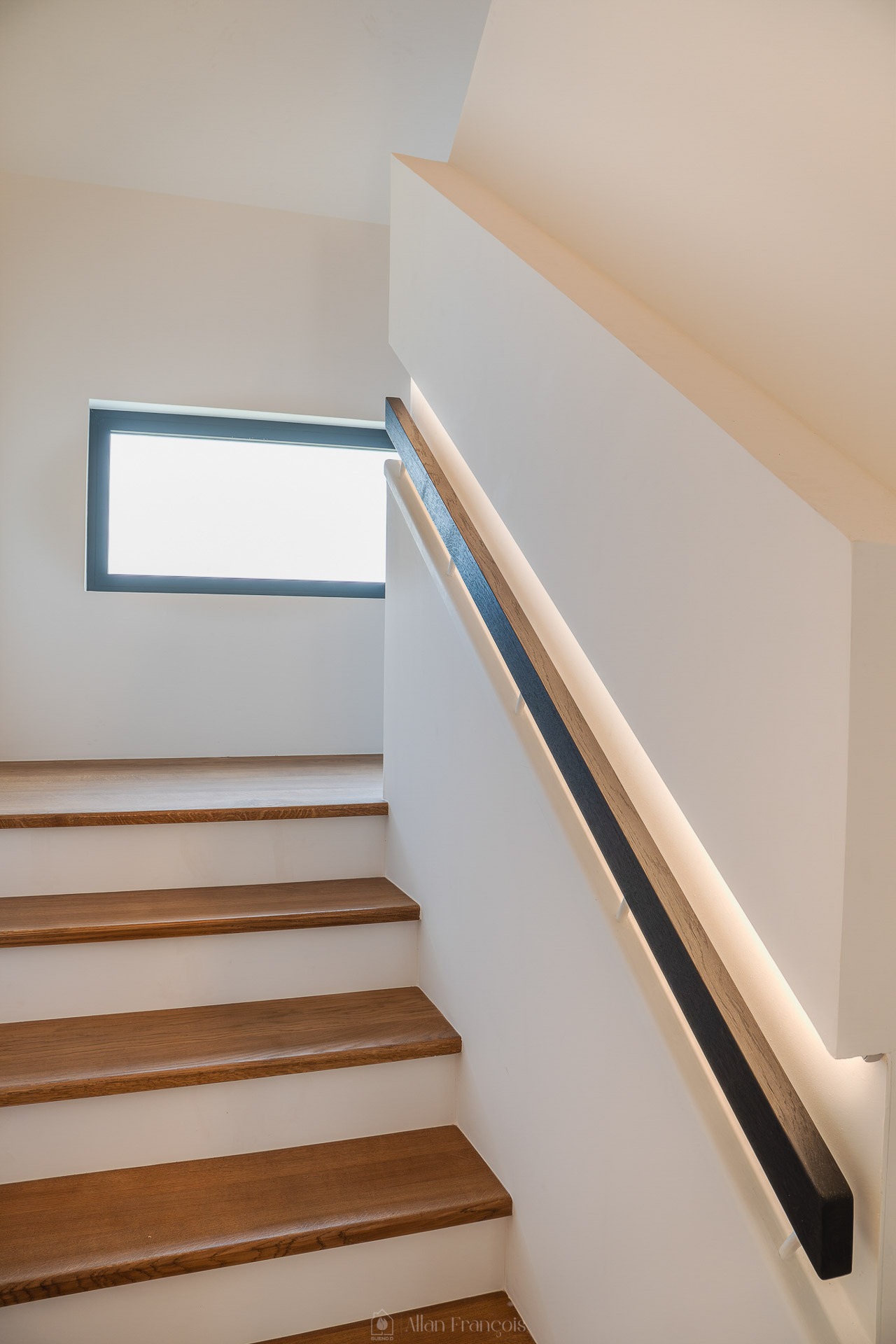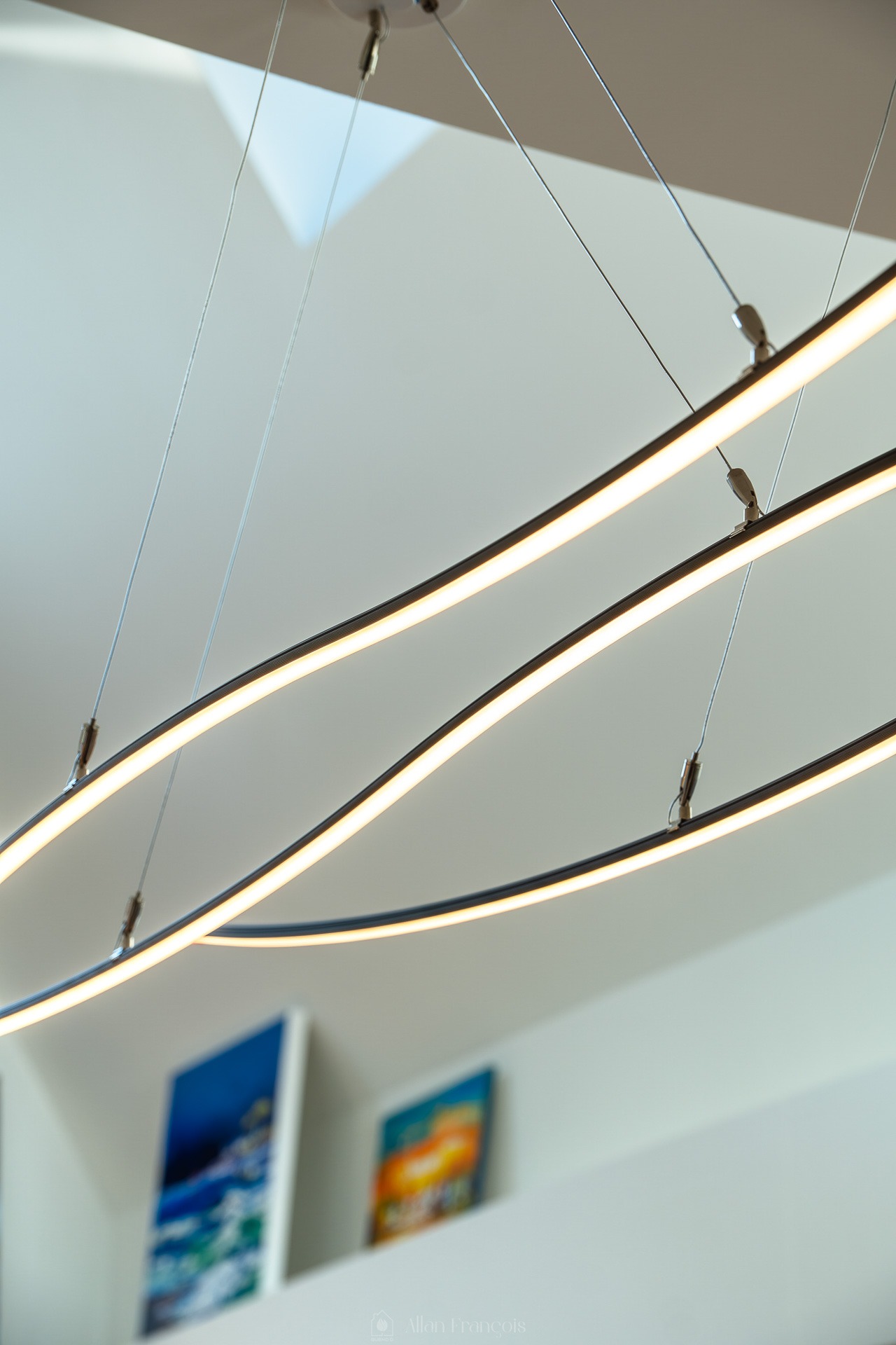 L’éclairage occupe une place centrale dans cette réalisation. Nous avons installé et raccordé différents types de luminaires afin de créer des ambiances variées et maîtrisées : rétro-éclairages intégrés dans les agencements, suspensions sculpturales, éclairages linéaires au-dessus des espaces de vie et LED intégrées dans l’escalier. Chaque point lumineux a été pensé pour s’intégrer parfaitement aux volumes et renforcer l’identité contemporaine de la maison.