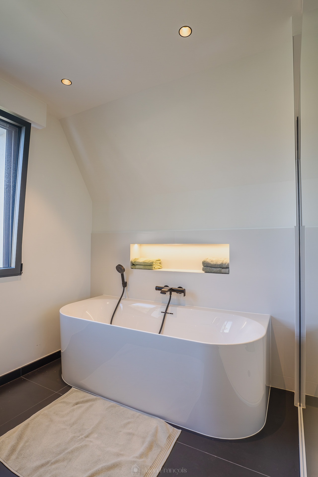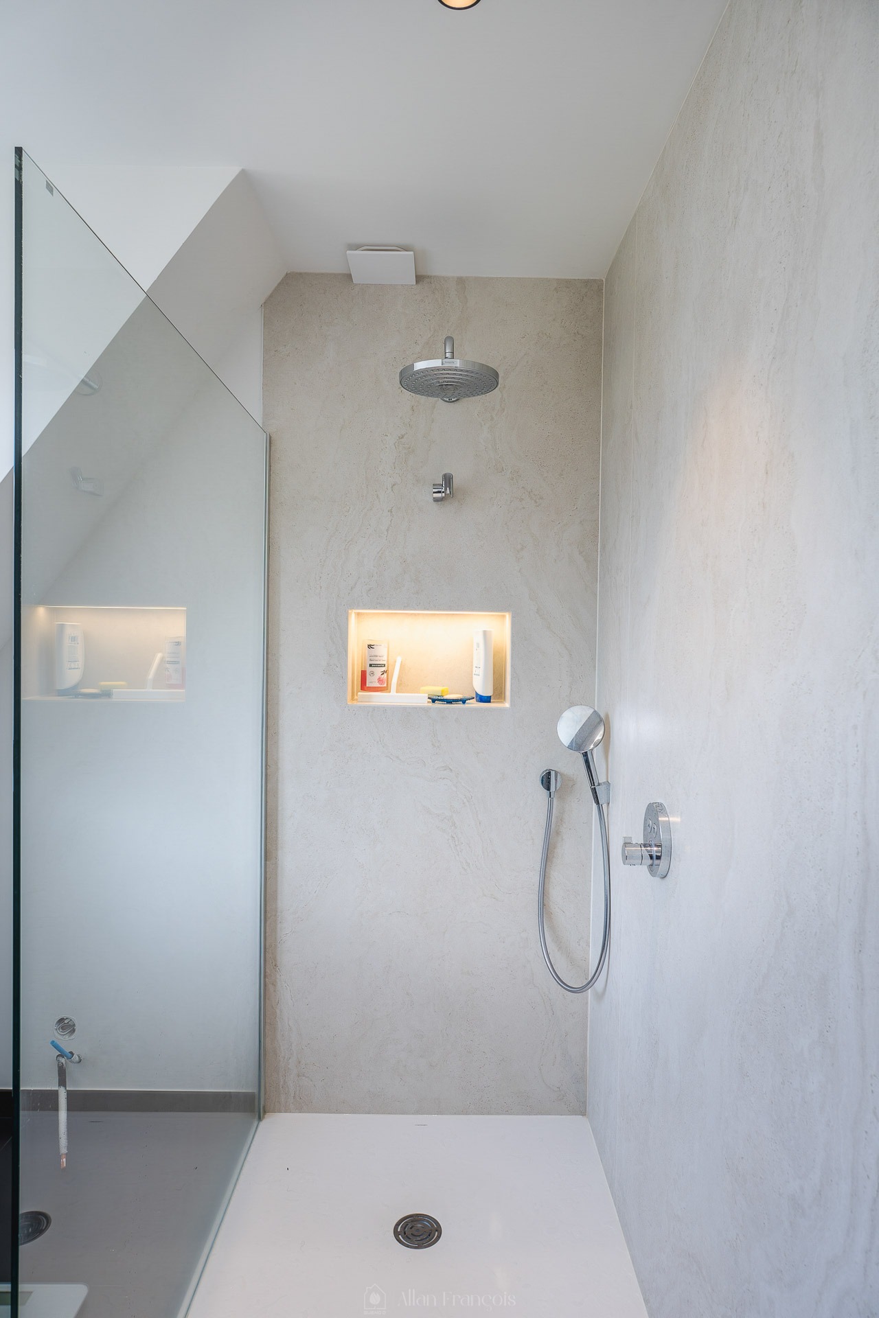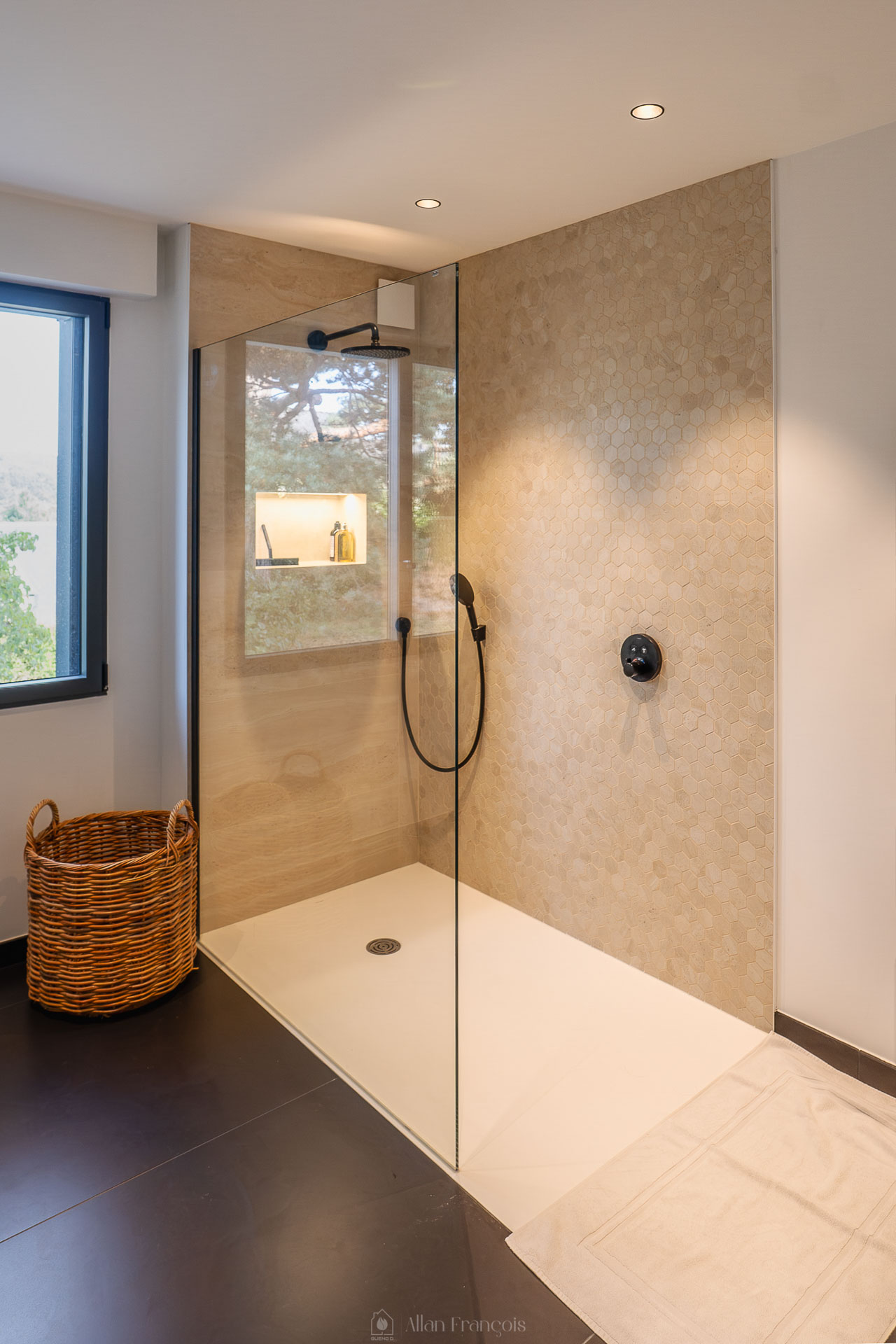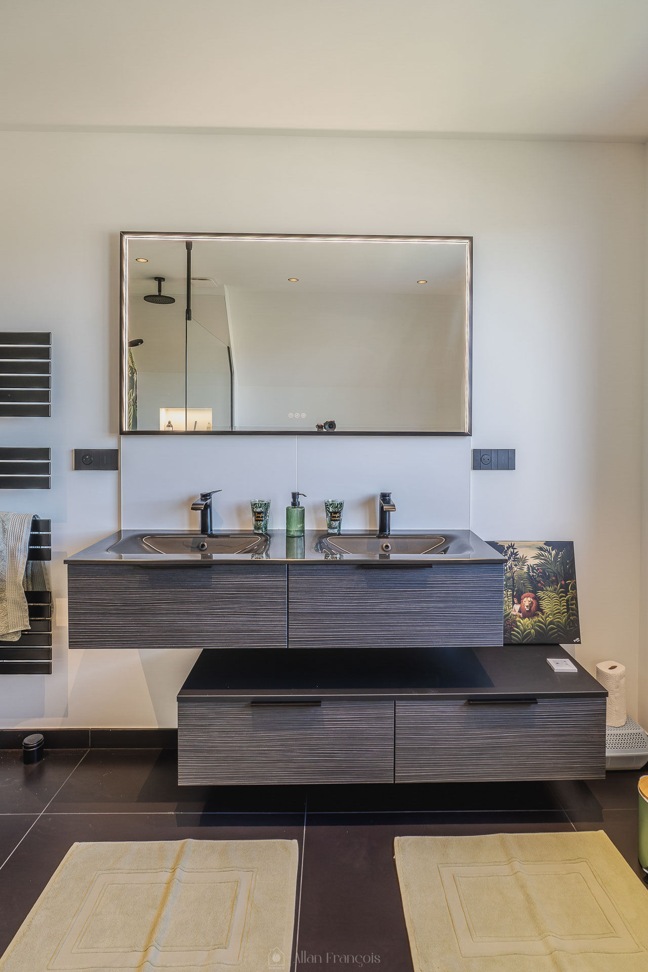 Nous sommes intervenus sur l’ensemble des lots plomberie, chauffage, ventilation et électricité, dans une logique globale et cohérente avec l’architecture du projet. Les salles de bains ont fait l’objet d’un travail particulièrement soigné, avec la pose d’équipements intégrés dans des agencements sur mesure : meubles vasques, miroirs rétroéclairés, douches avec mitigeurs encastrés et niches éclairées, baignoire îlot avec robinetterie murale, ainsi que des receveurs extra-plats et parois adaptées à chaque espace.