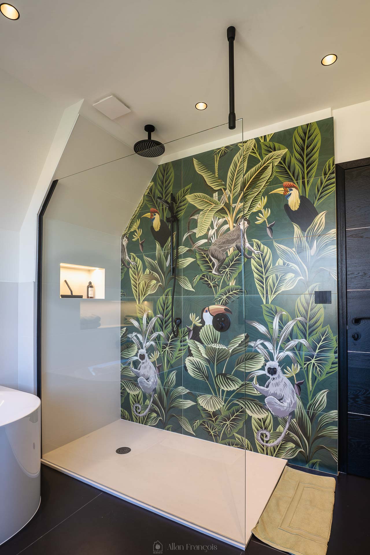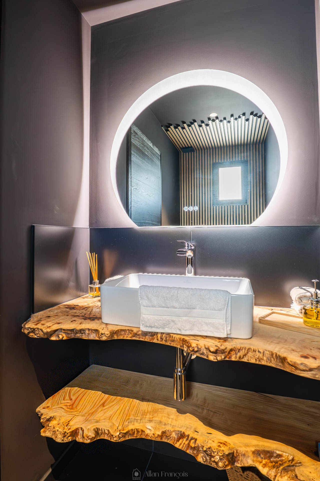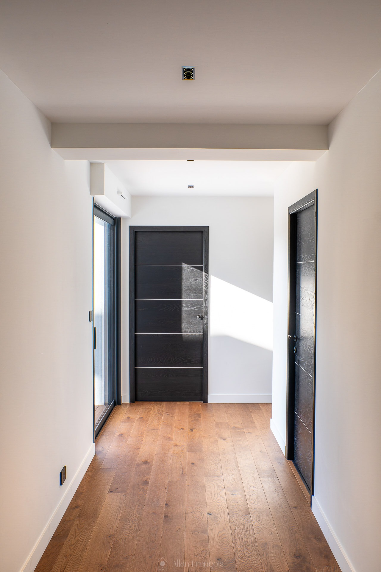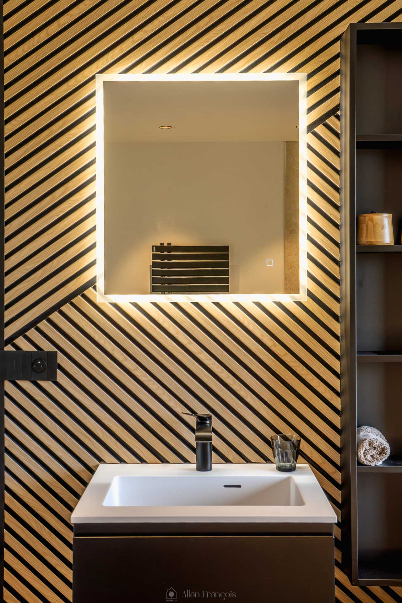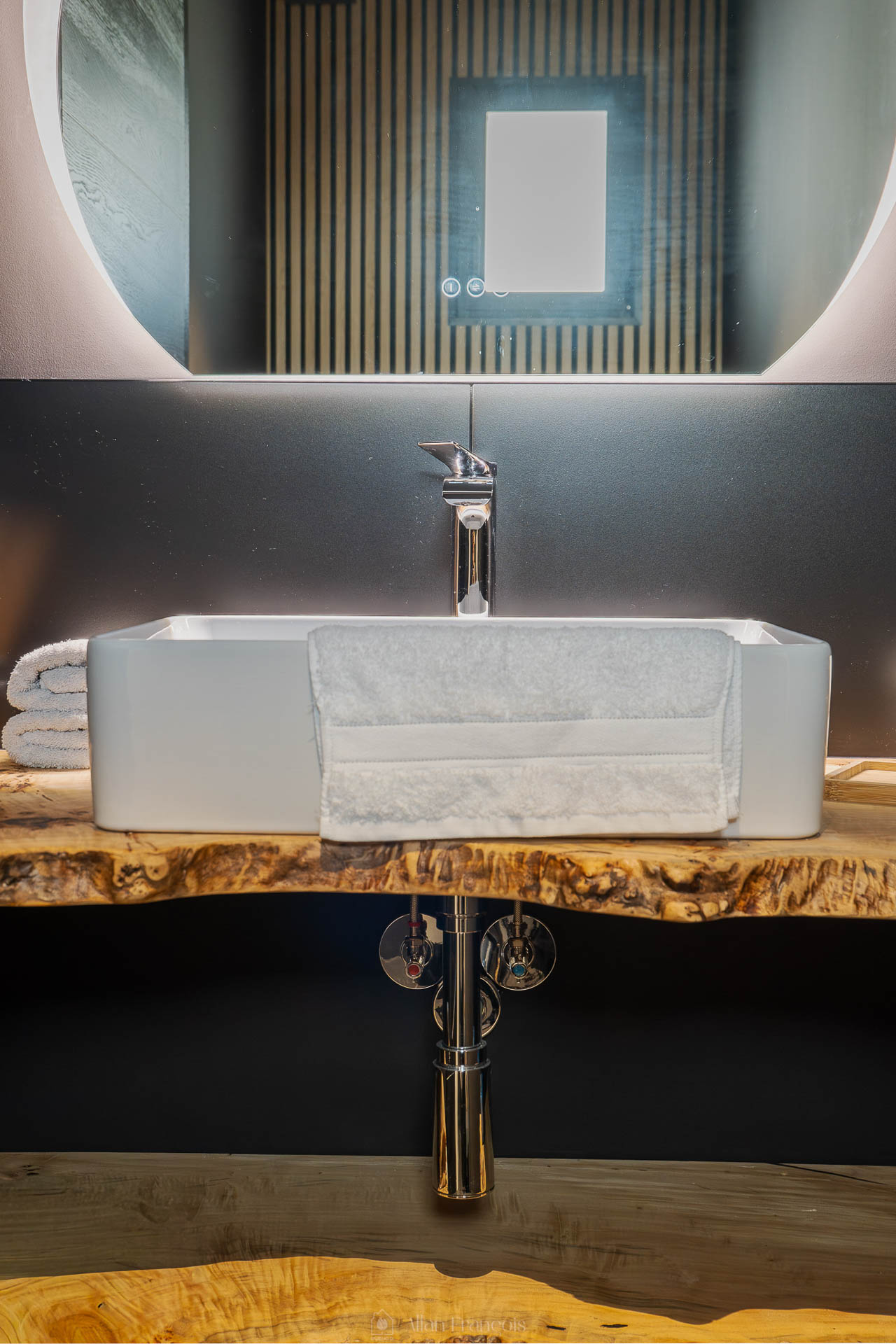 Nous sommes intervenus sur l’ensemble des lots plomberie, chauffage, ventilation et électricité, dans une logique globale et cohérente avec l’architecture du projet. Les salles de bains ont fait l’objet d’un travail particulièrement soigné, avec la pose d’équipements intégrés dans des agencements sur mesure : meubles vasques, miroirs rétroéclairés, douches avec mitigeurs encastrés et niches éclairées, baignoire îlot avec robinetterie murale, ainsi que des receveurs extra-plats et parois adaptées à chaque espace.