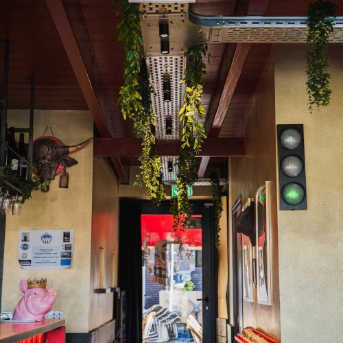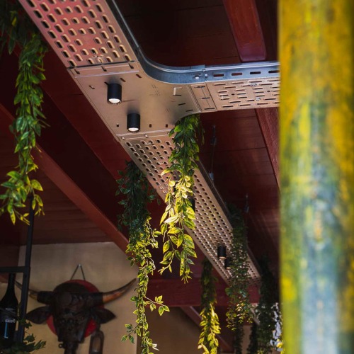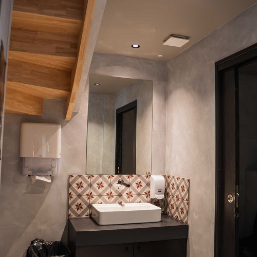 Nous sommes intervenus sur l’ensemble des installations techniques, comprenant les éclairages, les sanitaires et le chauffage. Chaque équipement a été pensé pour répondre aux contraintes d’un établissement recevant du public, tout en participant à l’ambiance générale du bar.