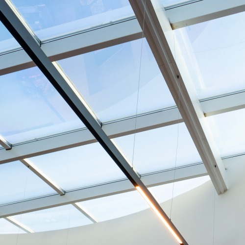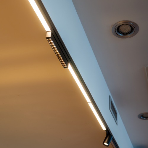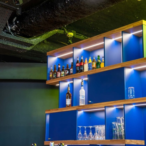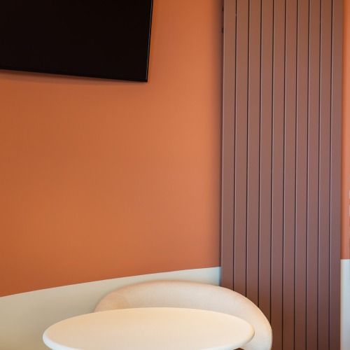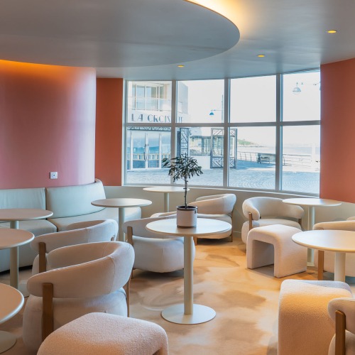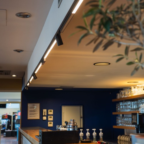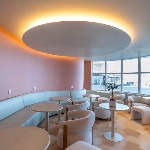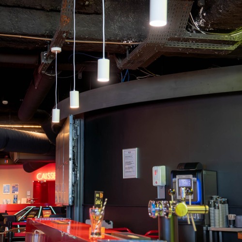 Au niveau de la brasserie, MORIN D a réalisé la création des espaces café et du nouveau salon, avec un travail spécifique sur le placo courbé et la conception d’un plafonnier sur mesure. De notre côté, nous avons entièrement repensé la mise en lumière de ces espaces et assuré les installations de chauffage, ventilation et plomberie, afin d’accompagner les nouveaux volumes et usages.