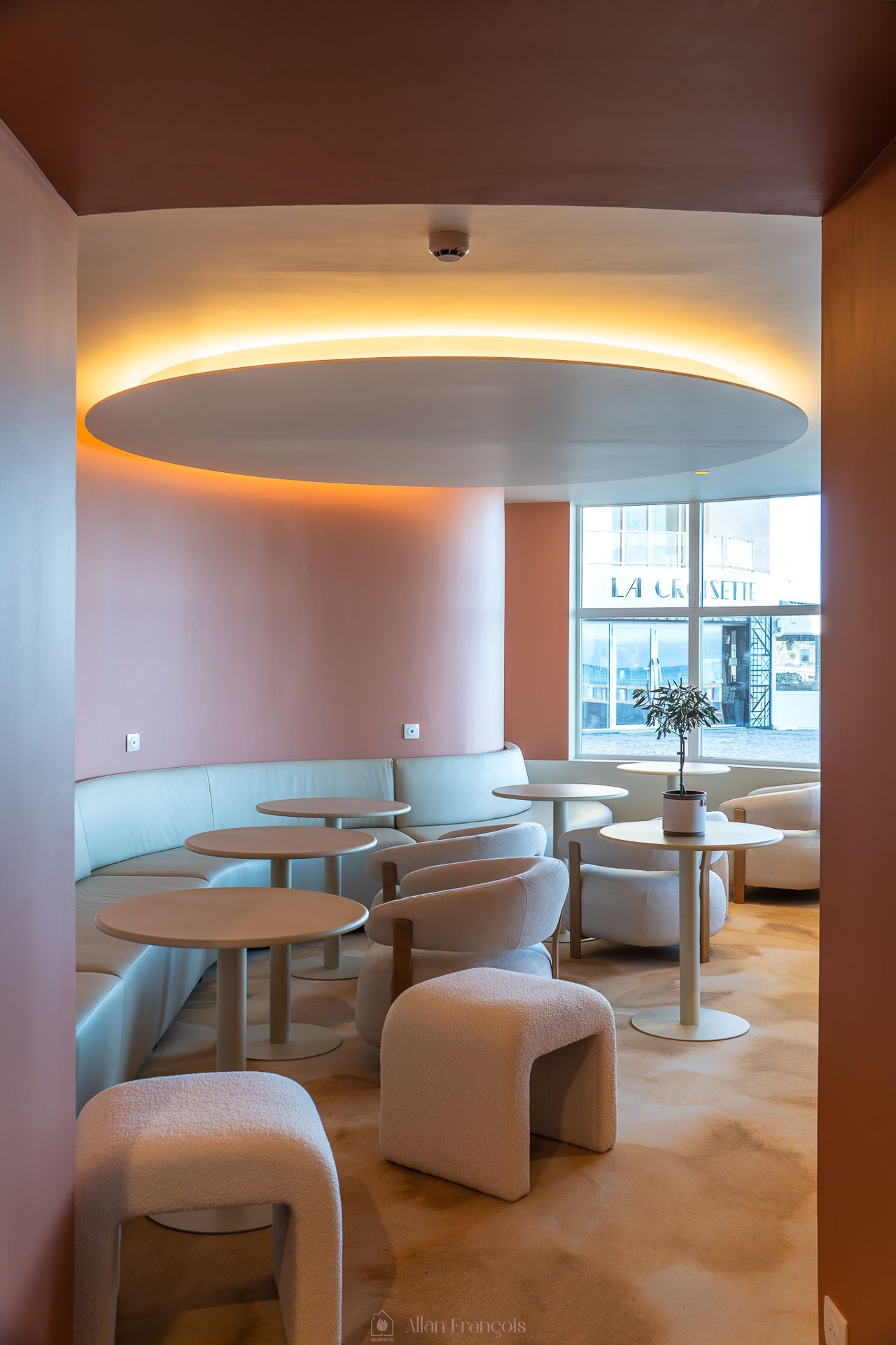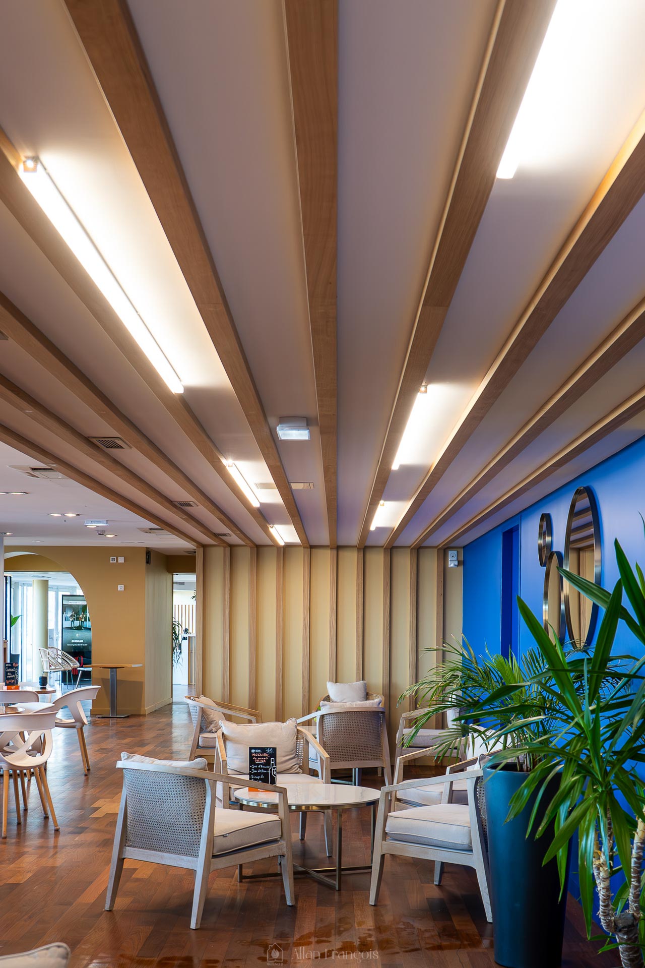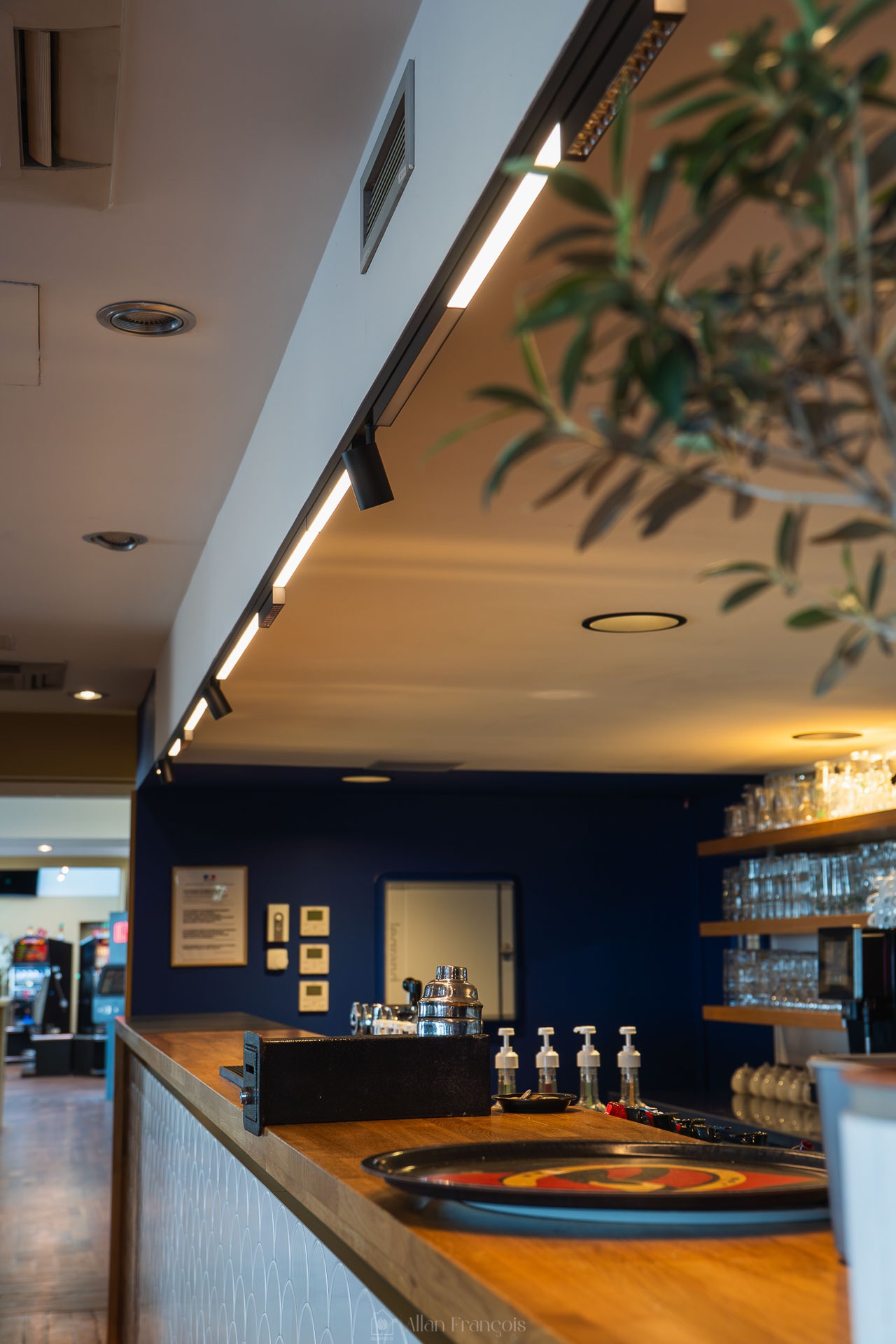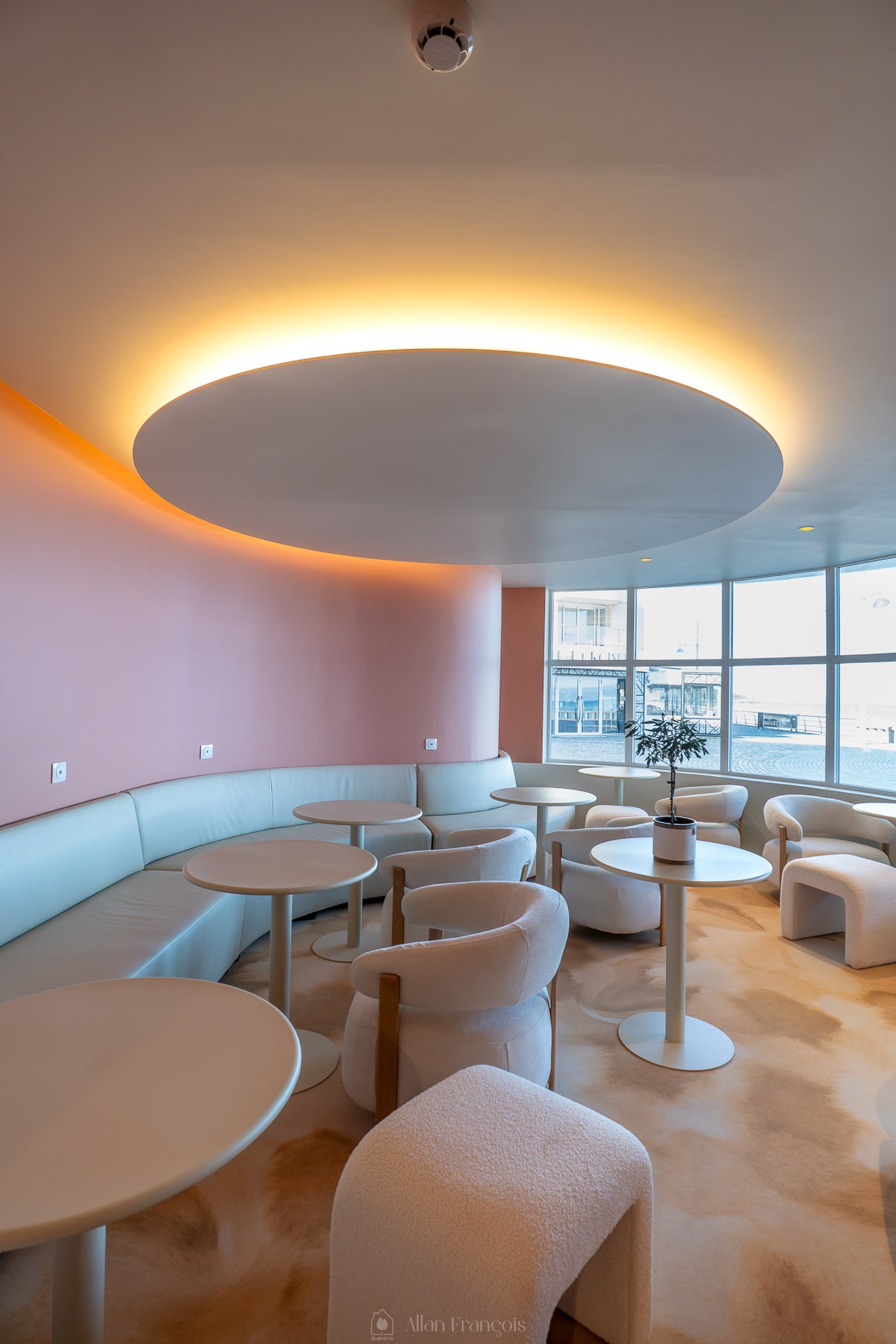 Au niveau de la brasserie, MORIN D a réalisé la création des espaces café et du nouveau salon, avec un travail spécifique sur le placo courbé et la conception d’un plafonnier sur mesure. De notre côté, nous avons entièrement repensé la mise en lumière de ces espaces et assuré les installations de chauffage, ventilation et plomberie, afin d’accompagner les nouveaux volumes et usages.