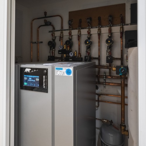 Le système de chauffage repose sur un plancher chauffant installé sur les quatre niveaux, associé à une pompe à chaleur géothermique, offrant un confort thermique homogène et performant sur l’ensemble de l’habitation.